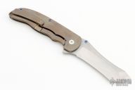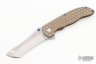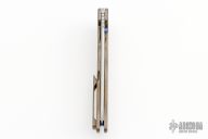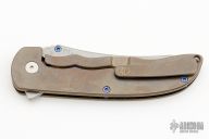 This Norseman (#2328) by John Grimsmo features a tumbled blade with a single anodized titanium thumb stud, notched thumb ramp and flipper. Stonewashed and anodized titanium frame with a honeycomb pattern front scale and titanium screws. Matching tip up pocket clip.  Very smooth action that requires no wrist movement. Nice detent, lockup and blade seating. Rides on ceramic bearings. Comes with original box and COA dated May 16, 2019. Excellent condition.