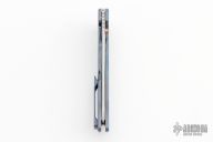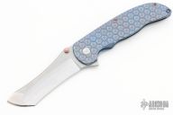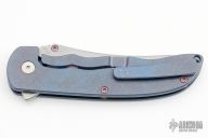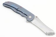 This Norseman (#2501) by John Grimsmo features a tumbled blade with a single anodized titanium thumb stud, notched thumb ramp and flipper. Stonewashed and anodized titanium frame with a honeycomb pattern front scale and titanium screws. Matching tip up pocket clip.  Very smooth action that requires no wrist movement. Nice detent, lockup and blade seating. Rides on ceramic bearings. Comes with original box and COA dated July 5, 2019. Excellent condition.