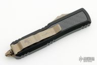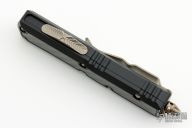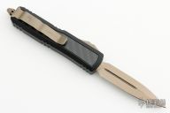 This Daytona OTF automatic features a D/E bronze tumble finished blade with standard edges, and carbon fiber inlays in the black aluminum handle. Tip down bronzed and tumbled stainless clip and hardware. Serial number 296 and dated 09/2022. Comes with original box and papers. Excellent condition.