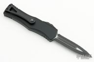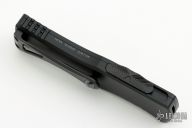 This Hera by Microtech Knives features a double-edged black blade with a fully serrated edge and dual fullers. The handle has a black aluminum frame with a tip down DLC titanium clip with ceramic ball inset. Dated 12/2022 and s/n 7148. Comes with original box and papers. Excellent condition.