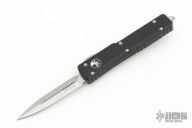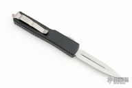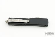 This UTX-70 OTF automatic by Microtech features a stonewash finished blade with a standard edges. The handle has a black aluminum frame with blasted stainless steel tip down clip. Serial number 40425 and dated 11/2022. Comes with original box and papers. Excellent condition.