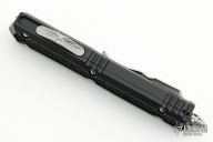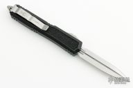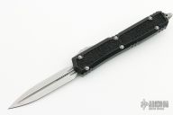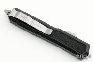 This Makora OTF automatic by Microtech features a stonewashed double edge blade. The handle has a black aluminum frame with nonslip inlays, stainless steel clip, tip down carry. Dated 10/2022 and 2698on clip. Comes with the original box and papers. Excellent Condition.