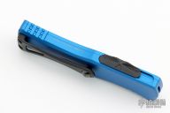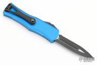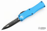 This Hera by Microtech Knives features a stonewashed blade with full serrations.  The handle has a blue aluminum frame with a tip down titanium clip with ceramic ball inset. Dated 07/2022 #5003. Comes with original box and papers. Excellent condition.