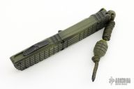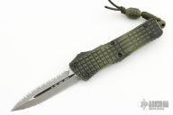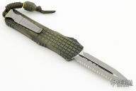 This Combat Troodon OTF automatic by Microtech knives features a double edged, Apocalyptic finished reverse full serrated blade. The handle has a grenade green frag pattern aluminum handle with black hardware, tip down carry. Glass breaker. S/N 474. Comes with original box and papers. Excellent condition.