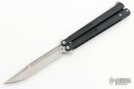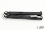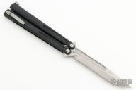 This Tachyon III balisong by Microtech Knives has a stonewash finished blade with false top edge. The handles are integral black aluminum with spring latch and tip up stainless steel clip, bead blasted hardware. Includes original box and papers. Dated 08/2016 and s/n 00135. Has a few light scuffs, otherwise excellent condition.
