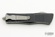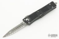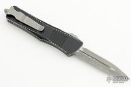 This Troodon OTF automatic features a double edged stonewashed finish blade with fully serrated edges. Stainless steel clip. Glass breaker. Distressed handle. Dated 02/2023 and S/N 11856. Comes with box and papers. Finish is distressed. Excellent condition.