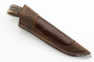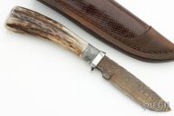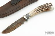 This Hunter by Herb Derr features a Damascus blade with file worked spine, .169" blade stock and .953" blade depth, hidden tang construction. The handle is comprised of a nickel silver guard and pommel with stabilized black ash burl and nickel silver spacer and a stag grip. Includes a brown leather sheath with lizard skin inlay. Excellent condition.
