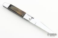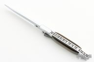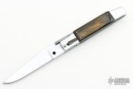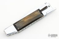 This Picklock Auto by Armenian Doctor Knives features a mirror polished flat ground blade. The handle has a polished stainless steel frame with fileworked stainless steel backspacer, buffalo horn scales with brass pins. New from maker.