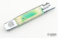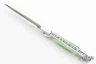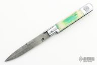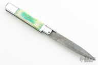 This Picklock Auto by Agasi Hambartsumian of Armenian Doctor Knives features a Damascus bayonet ground blade with a false top edge. The handle has a polished stainless steel frame with fileworked stainless steel backspacer, dyed bone scales with brass pins. New from maker.