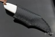 This Wharncliffe by Sam Cox features a hand rub satin finished blade with .087" blade thickness and 1.075" blade depth, full tang construction. The handle has white corian scales with red liners, scrimshaw by "Anna" marked #9. Includes a black leather sheath with belt loop. Excellent condition.