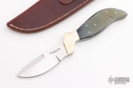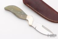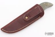 This knife by R&R Middleton features a mirror polished double edged blade with .150" blade stock and 1.060" blade depth, full tapered tang construction. The handle has nickel silver bolsters, horn scales. Comes with a brown leather sheath. Has a few light scratches, otherwise excellent condition.