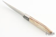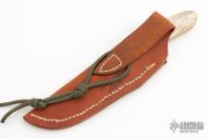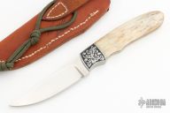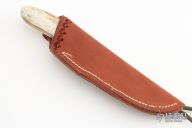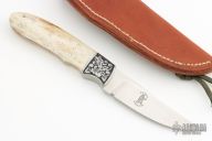 This knife by Russel Easler features a hand rub satin finished blade, .150" blade stock, .994" blade depth, full tapered tang construction. The handle has engraved stainless dovetailed bolsters, engraving done by "R Zima", giraffe bone scales with red liners. Excellent condition. Includes leather sheath dated '05 and a zippered case.