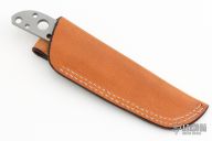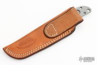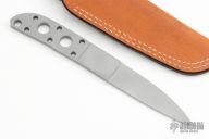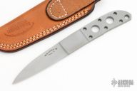 This Loveless style Stiff Horn by Mike Lovett features a bead blast finished blade, with an integral handle with a bead blast finish, .110" blade stock and .767" blade depth. Has a lanyard hole and a nice leather sheath. Excellent condition. Comes with a zippered case.