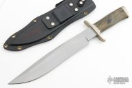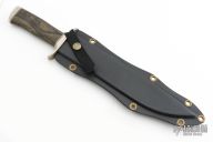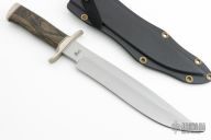 This Fighting Bowie by D'Alton Holder features a bead blasted blade with false top edge, .245" blade stock and 1.641" blade depth, hidden tang construction. The handle features a nickel silver guard and butt, dymondwood grip. Comes with a kydex sheath. Has a few light scuffs, otherwise excellent condition. Comes with a zippered case.