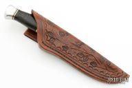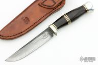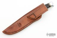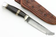 This hunter by Chuck Schuette features a forged blade from a Nicholson file, .167" blade stock and .985" blade depth, hidden tang construction. The handle has a nickel silver guard, stacked leather grip with brass and blue spacers, aluminum butt. Comes with hand tooled brown leather sheath with belt loop. New from maker.