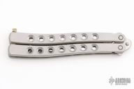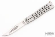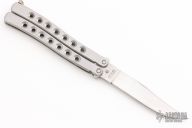 This Balisong by Parker Cutlery Company features a satin finished blade. The handles are satin finished stainless steel with a nickel silver t-latch. Comes with original box. Excellent condition.