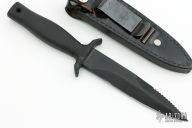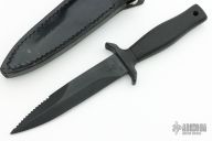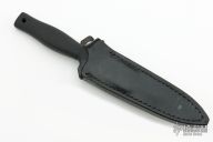 This Command I Boot Knife (B1085S) has a black finished stainless steel spear point partially serrated blade with hidden tang. Blade width is 1/4", depth is 15/16". Handle is black aluminum with double guard and lanyard hole. Has a few light scuffs, otherwise excellent condition. Comes with a black leather sheath with button closure and belt clip.