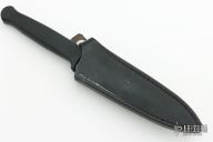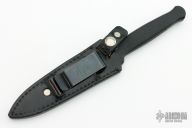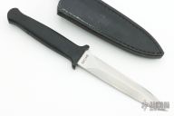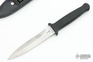 This Guardian I by Gerber features a double edged satin finished blade, .162" blade stock and .826" blade depth, hidden tang construction. The handle is black aluminum. Serial # B6128S. Has some light scratches, otherwise excellent condition. Comes with original black leather sheath.