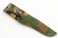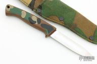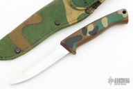 This A400 by Gerber has a satin finished high-speed tool steel/ hard chrome plated drop point blade with hidden tang, .083" blade stock, .753"  blade depth. Handle is camo Armorhide with lanyard hole. Excellent/ unused condition. Comes with Gerber camo nylon sheath.  Only 800 of these were made.