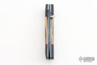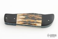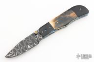 This knife by Jake Elenbaas features a clip point Alabama Damascus blade with single thumbstud with yellow stone inlay. The handle has black G-10 bolsters, front and rear, mammoth ivory scales, anodized titanium liners with jeweled interiors and a black G-10 backspacer. Nice lockup and blade seating. Comes with COA. New from maker.