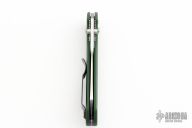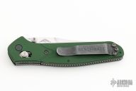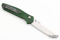 This Benchmade Osborne 940 features a tumble finished clip point blade with swedge and dual thumb studs. The handle is comprised of a machined and green anodized aluminum frame over jimped and purple anodized titanium backspacer. The black coated, steel tip up clip is reversible for right or left hand carry. Has a couple light scuffs, otherwise excellent condition. Comes with original box and papers.