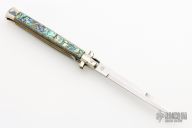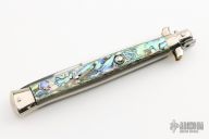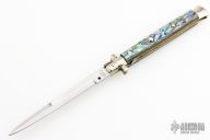 This 11" Picklock Auto by AGA Campolin features a polished bayonet ground blade with false top edge. The handle has nickel silver bolsters, front and rear, abalone scales, brass liners, stainless spring. Excellent condition. Limited Edition #007 of 140
