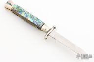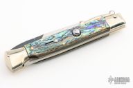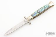This 9" Swinguard Auto from A.G.A. Campolin has a mirror polished stainless steel spear point blade with false top edge. Handle has abalone scales with mirror polished nickel silver bolsters and pommel, brass liners, brass pins, stainless steel back spacer, and a safety. Excellent condition.
