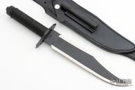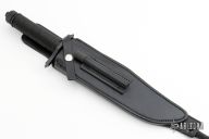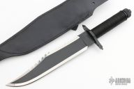 This knife features a two-tone blade with black center and satin finished grinds, 14 saw-teeth on blade spine and sharpened top edge, .258" blade stock and 1.825" blade depth, hidden tang construction. The handle has a black stainless steel double guard with flat and Phillips head screwdrivers, hollow cord wrapped handle, and aluminum removable butt cap with a compass and an O-ring to make it waterproof. Comes with black leather sheath with a diamond sharpener in the sheath and a Lile zippered case. Designed by Jimmy Lile and made by Vaughn Neeley. New From Maker!