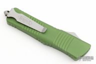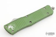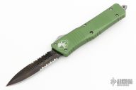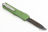 This Troodon OTF automatic features a double-edged black blade with partial serrations. The handle is composed of green aluminum with a stainless steel clip. Glass breaker. S/N #12580, dated 10/2014. Includes the original box and papers.  Excellent Condition.