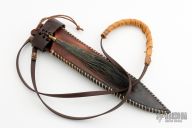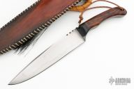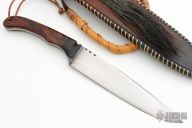 This Western Crossdraw Bowie by Kaji Customs features a hand rub satin finished blade with fileworked thumbrest and a false top edge, .245" blade stock and 1.503" blade depth, full tang construction. The handle has ebony wood bolsters, desert ironwood scales with ebony pins and a copper lanyard hole. Comes with a brown leather sheath with biothane strap with leather wrap. The sheath has a turkey bead on the front. New from maker.