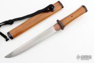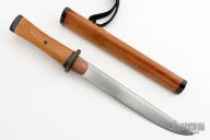This Tanto by Kaji Customs features a hand rub satin finished blade with hamon, .180" blade stock and .950" blade depth, hidden tang construction. The handle has a copper habiki, brass seppa, white stingray skin with black cotton tsukaito, and yew wood. Comes with a yew wood saya. New from maker. The individual components of this knife are nice, but the fit up is a little loose.