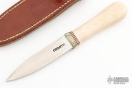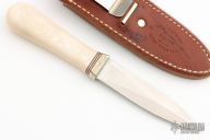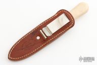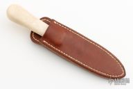 This Model 24 Guardian by Randall Made Knives features a satin finished double-edged blade with notched finger rests, .113" blade stock and .846" blade depth, hidden tang construction. Ivory paper micarta grip with red/white/blue spacers and a nickel silver guard. Both edges of the blade are sharpened with 1" of thumb notches. This model was designed in 1978 for use by police, undercover agents and law enforcement personnel for self-protection and as a back-up weapon. Comes with a brown leather sheath w/ boot clip. Has some patina, otherwise excellent condition.