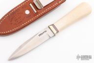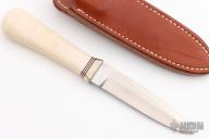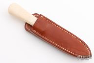 This Gambler by Randall Made Knives features a satin finished blade with .165" blade stock and .840" blade depth, hidden tang construction. Sharpened top edge. Notched thumbrest. Ivory paper micarta grip with brass guard, red/white/blue spacers. The Gambler is one of Randall's non-catalog knives. Brown leather sheath with boot clip. Has some patina, otherwise excellent condition.