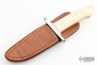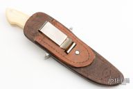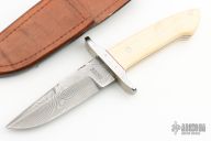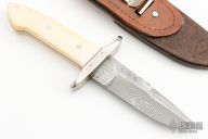This Chute Knife by James Hand features a Damascus blade with a false top edge, .210" blade stock and 1.230" blade depth, mortise tang construction. The handle features mammoth ivory scales with red liners and a stainless steel guard. Comes with a brown leather sheath. Has some scratches and patina, otherwise good condition.