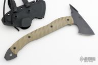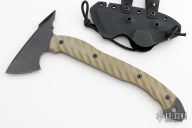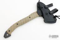 This Bleeding Heart Tomahawk by Half Face Blades features a black cerakoted 2.5" blade with spike at the rear, .234" blade stock, full tang construction. The handle has tan G-10 scales. Comes with a kydex sheath. Excellent condition.
