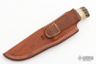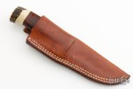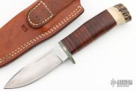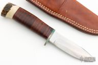 This Model 15 by Morseth Knives features a satin finished laminated blade with .177" blade stock and .925" blade depth, hidden tang construction. The handle has a nickel silver guard, stacked leather grip with black/red spacer pattern and a stag butt. Comes with a brown leather sheath, Has a couple light scratches, otherwise excellent condition. Dated 1992 and made by Bob Dozier