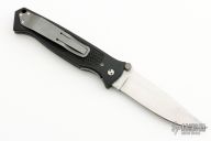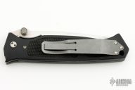 This Vallotton Chameleon D/A has a clip point satin finished blade with dual thumb studs and notched thumb rest. Handle is black FRN composite scales with rubber inlay, stainless steel liners and tip up clip. This knife has a hidden button under the rubber inlay on the A-side. Has some light scuffs and scratches, otherwise excellent condition. #94