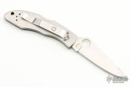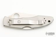 This Delica by Spyderco features a satin finished blade with thumbhole. The handle has a satin finished stainless steel frame, tip up or down stainless steel clip. Has some scuffs and scratches, otherwise good condition.