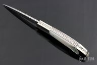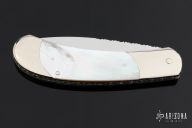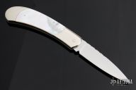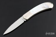 This Palm Release Auto by Ken Steigerwalt features a mirror polished blade with fileworked spine. The handle has nickel silver bolsters, front and rear, mother of pearl scales, fileworked nickel silver liners, fileworked stainless steel backspacer. Nice action, lockup and blade seating. Has swirl marks in the finish, otherwise excellent condition.