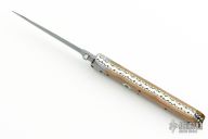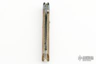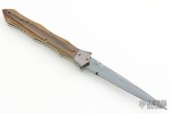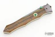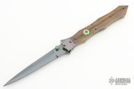 This Royal Dagger D/A Auto by Nate Clark features a spear point Damascus blade with false top edge and single knurled thumbstud with green jewel inlay. The handle has Damascus bolsters, mammoth ivory scales, anodized and fileworked titanium liners, and a fileworked stainless steel backspacer. Green jewel inlay on the push button as well. Nice detent, lockup and blade seating. Excellent condition.