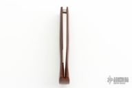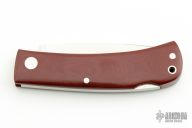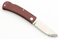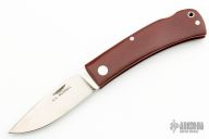 This lockback folder by AG Russell features a satin finished blade with nail nick. The handle has red linen micarta scales, no liners, stainless steel lock release and a red linen micarta backspacer. Has some scratches, otherwise good condition. Comes with original nylon sheath.