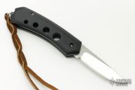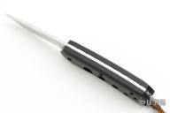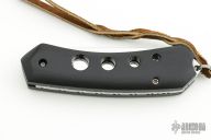 This Left-handed scale release auto by Mike Whiskers Allen features a mirror polished blade with fileworked spine. The handle has black aluminum scales and a fileworked stainless steel backspacer. There is a lanyard hole at the butt. Excellent condition. Nice action, lockup and blade seating.  Comes with nylon belt sheath.