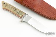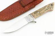 This Hunter by N.R. Tingey features a orange peel finished clip point blade with a full tang construction.  .184" Blade Stock.  1.052" Blade Depth.  The handle features an engraved nickel silver guard, ram horn scales and red liners.  Includes a brown leather sheath.  Excellent Condition.