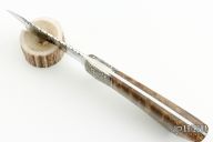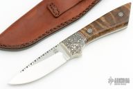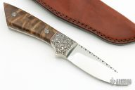 This knife by RD Nolen features a mirror polished drop point blade with .128" blade stock and 1.214" blade depth, full tang construction. The handle has engraved and dovetailed nickel silver bolsters, curly maple scales, nickel silver pins. Comes with a brown leather sheath.  Excellent Condition.
