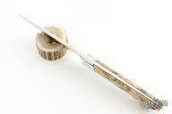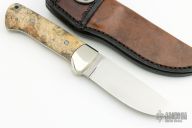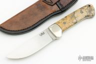 This Hunter by Dan Kendrick features a hand rub satin finished blade with .156" blade stock and 1.245" blade depth, full tapered tang construction. The handle has a nickel silver guard, burl scales and mosaic pins. Includes a brown leather sheath.  Excellent Condition.