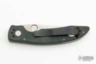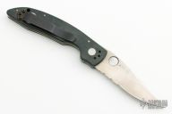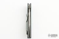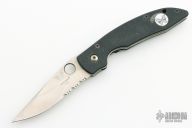 This Mini AFCK Linerlock folder by Benchmade has a satin finished partially serrated blade with thumbhole, and notched thumbrest. Handle is black G-10 over titanium liners, black fiber back spacer, lanyard hole. Has scuffs and scratches, otherwise good user condition.