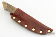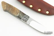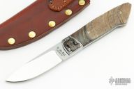This Fixed Blade from Ken McFall features a mirror polished drop point blade with .186" blade stock and .949" blade depth, full tapered tang construction. The handle has an engraved and dovetailed stainless steel bolsters, rams horn scales with mosaic pins. Comes with a brown leather sheath. Excellent condition.