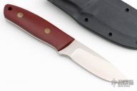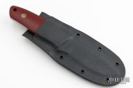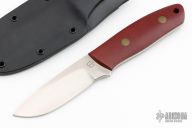 This early drop point from Dozier Knives features a satin finished blade with .156" blade stock and 1.073" blade depth, full tang construction. The handle has red linen micarta scales with brass pins and a lanyard hole. Comes with a kydex sheath. Has some light scratches, otherwise good condition.