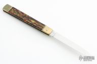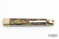 This leverlock auto by Hubertus features a drop point blade, nickel silver double bolsters, X-Mas Tree Acrylic scales, and brass liners and pins. Opens with a nice snap. Very fast opening. Has a couple light scratches, otherwise excellent condition. Rare