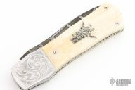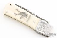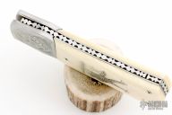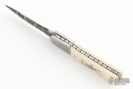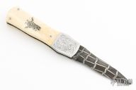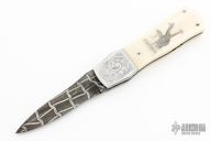 This bolster release auto by Mel Fassio features a fishing net mosaic Damascus blade with fileworked spine. The handle has dovetailed and engraved stainless steel bolsters, scrimshawed hippo bone scales, stainless liners, fileworked stainless steel backspacer. Fires hard. There is a very slight crack in the scale at one of the screws. Excellent condition otherwise.